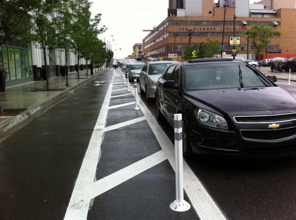 A European import: the "complete street" on Kinzie Avenue with pedestrian and bike lanes protected from auto traffic by a line of parked cars. Kinzie is a pilot. The city plans to install 100 miles of protected bike lanes in the next four years. (Image: Steven Vance CC by/nc/sa)
